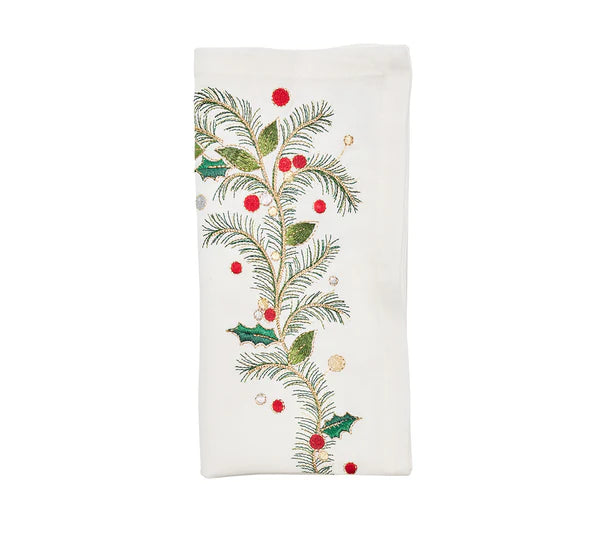 The Christmas Carol Napkin sets a festive tone with hand-drawn boughs of holly and bright berries delicately embroidered on crisp white linen.