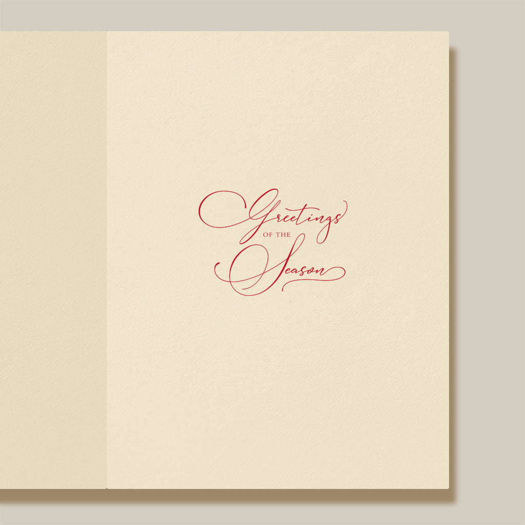 The wreath radiates warmth and joy, making it the perfect centerpiece for your holiday messages. Inside, the card reads "Greetings of the Season" printed in red ink. The matching envelope is lined with hunter green.