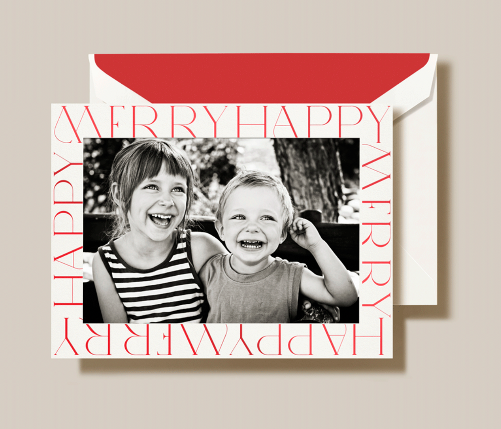 With an enchanting trim that speaks your sentiments in the most merry of ways, you'll spread the cheer through and through. Matching envelopes are lined in scarlet and the greeting on the inside reads "Holiday Wishes" printed in red.