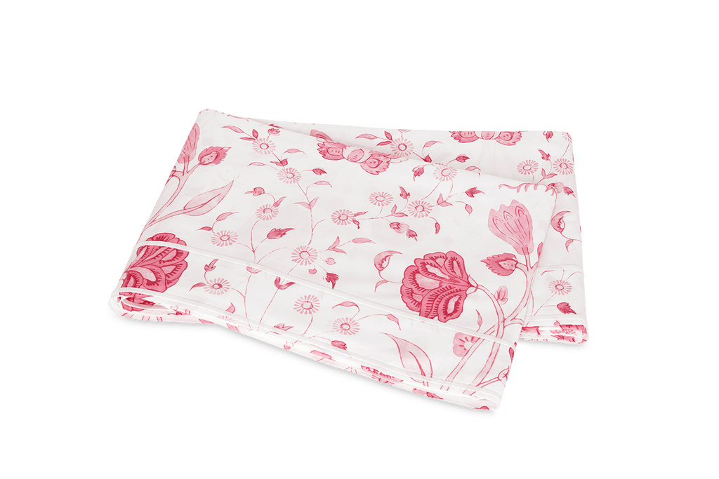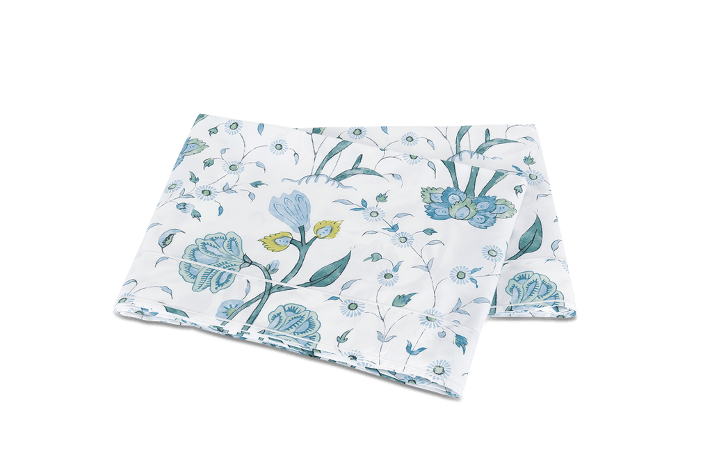 Khilana, a delightful, large-scale floral inspired by traditional Indian hand-block textiles, is a divine new addition to the Matouk Schumacher collection. It begins with our 500 thread count Luca percale, printed in Italy in a refined blue colorway, and is finished in their Massachusetts factory, where they craft a flange with a unique double satin stitch along the outer and inner edges.