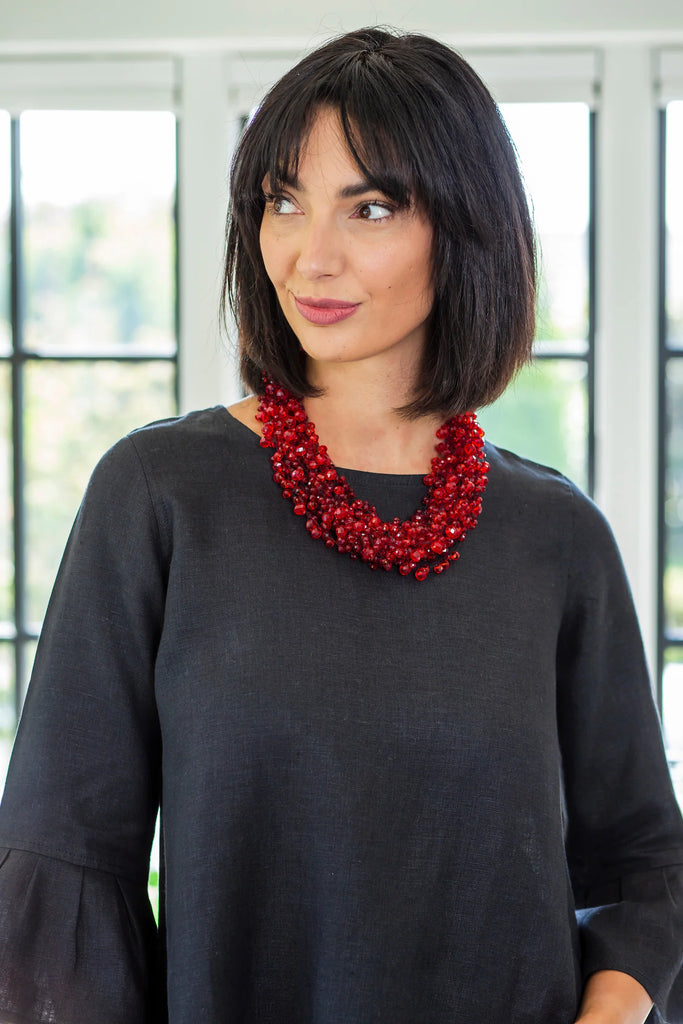 Made of many strands of crystal beads strung together. The necklace is lightweight and feels wonderful around your neck.