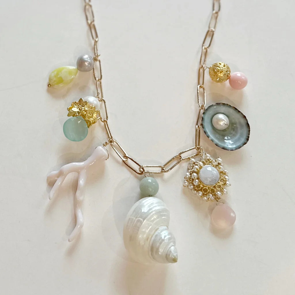 Seven unusual shell and gemstone charms dance from this 16'' gold plated chain, including freshwater pearls, moonstone, chalcedony, mother of pearl, a coral branch made of resin and natural shells. Necklace adjusts to 18.5''.