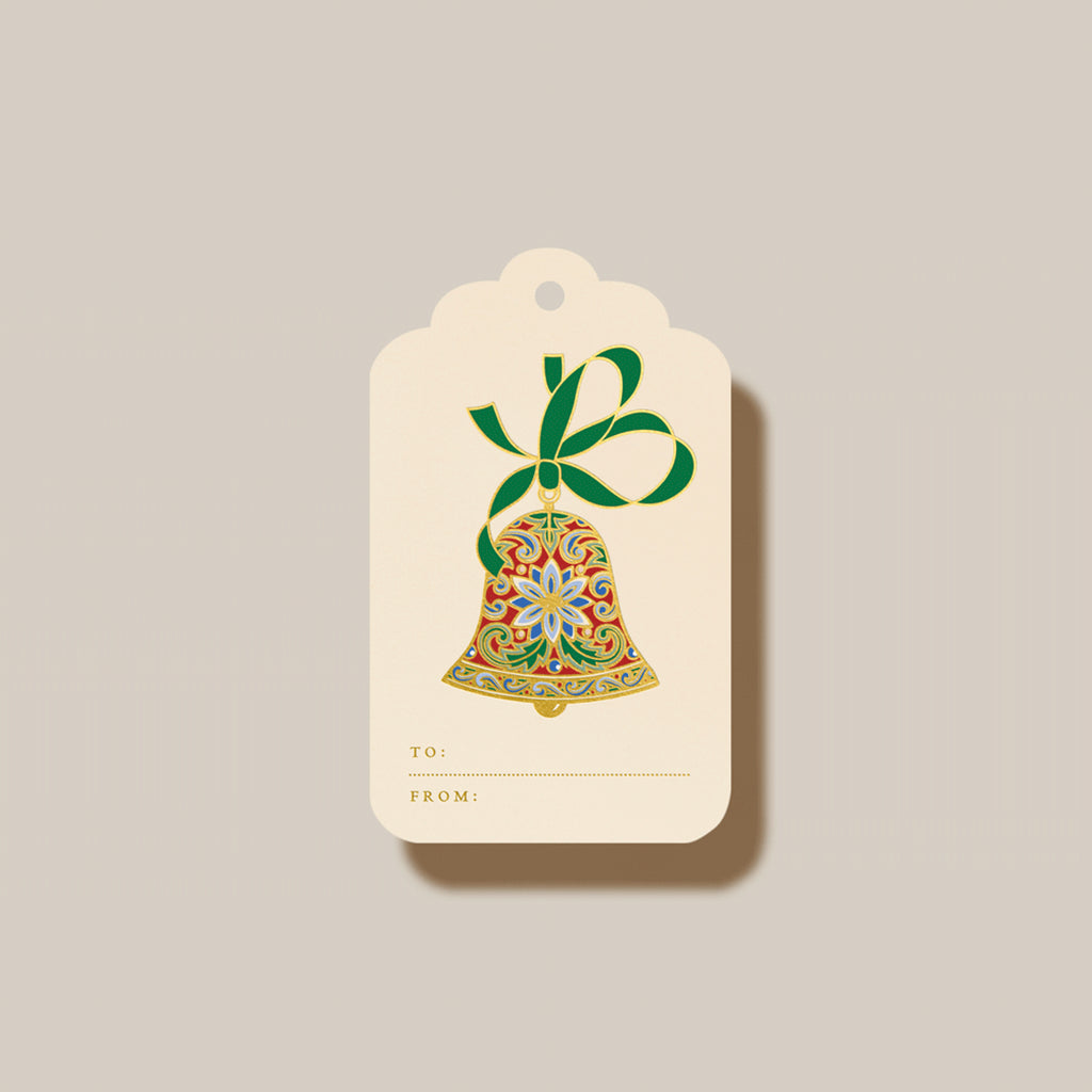 Featuring a darling bell and coordinating green bow on a classic ecru kid finish.