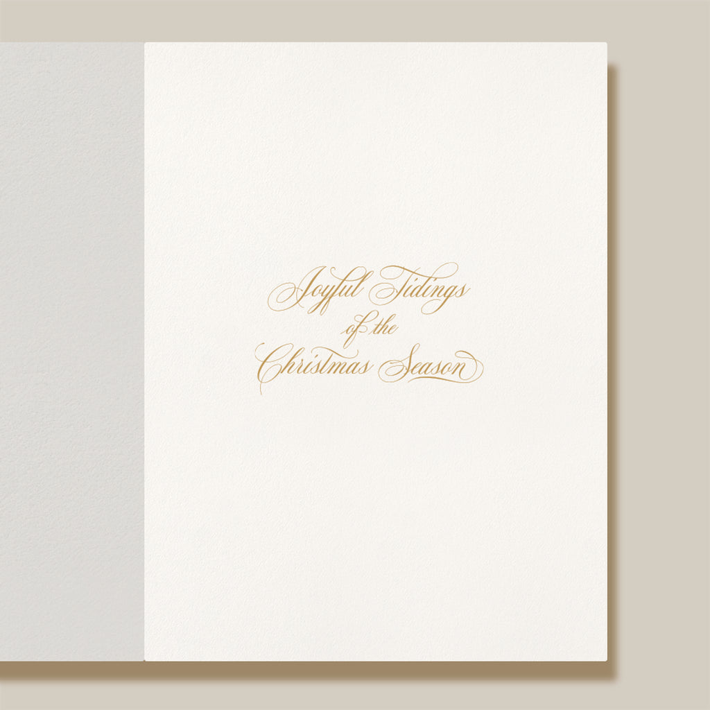 Whether adorning the highest bough of your meticulously decorated tree or adding grace to your holiday card, our fair angel radiates a celestial charm, watching over you and your cherished ones, ushering in a season of warmth and wonder. This card opens to read "Joyful Tidings of the Christmas Season" printed in gold. The matching envelope is lined with satin gold.