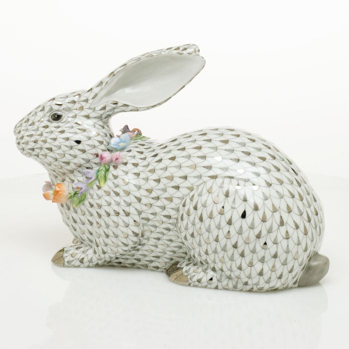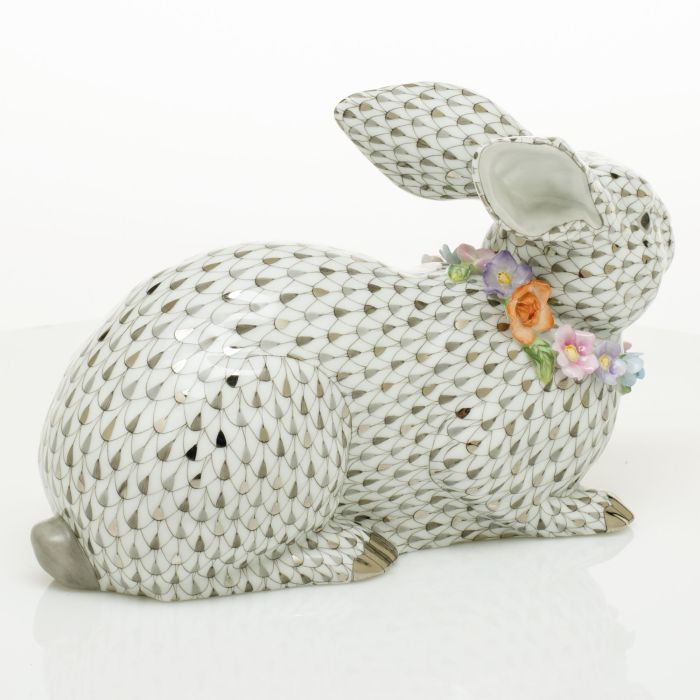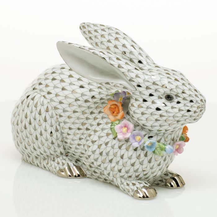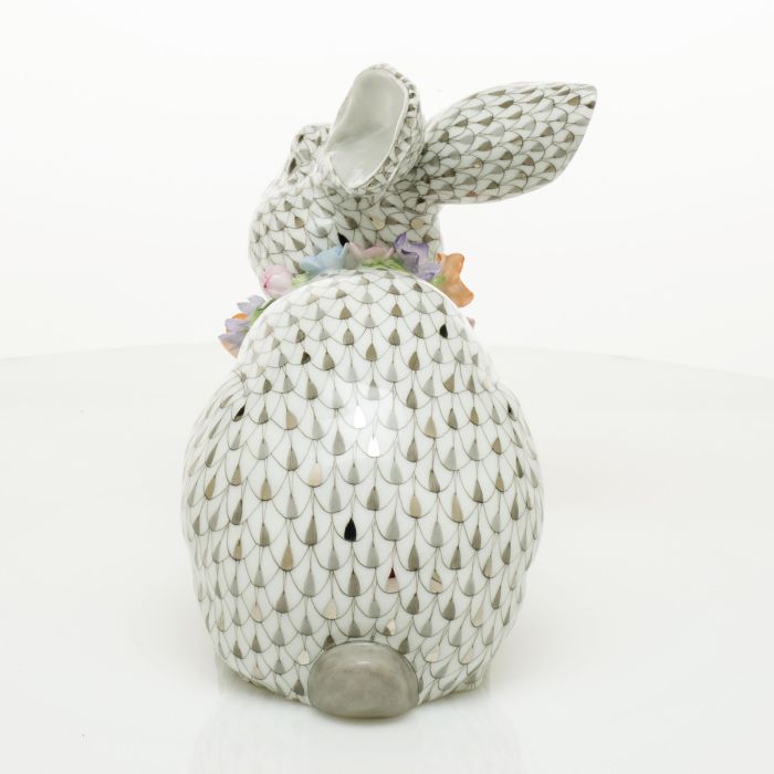 Clearly this gorgeous bunny has been eating her veggies because her gray coat is sparkling! Aware that her herbivore diet has made her the prettiest girl in the meadow, she has added to her allure by donning a beautiful floral garland. Usually her observant eyes would be scanning for predators but, in this case, she is simply taking in all of the admiring glances.