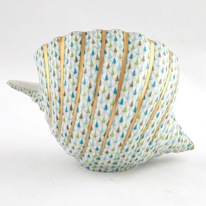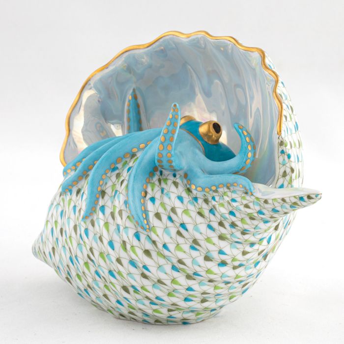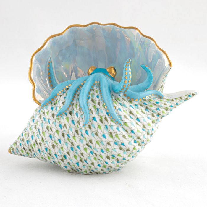 An octopus spends most of its solitary life living in a den only emerging at night to hunt for food. While a rock or random crevice is a common choice for a den, this octopus has clearly picked the equivalent of a luxury condo. A conch shell painted in fishnet colors reflective of the aquatic realm as well as pearlized paint and 24k gold accents make for a grand sanctuary.