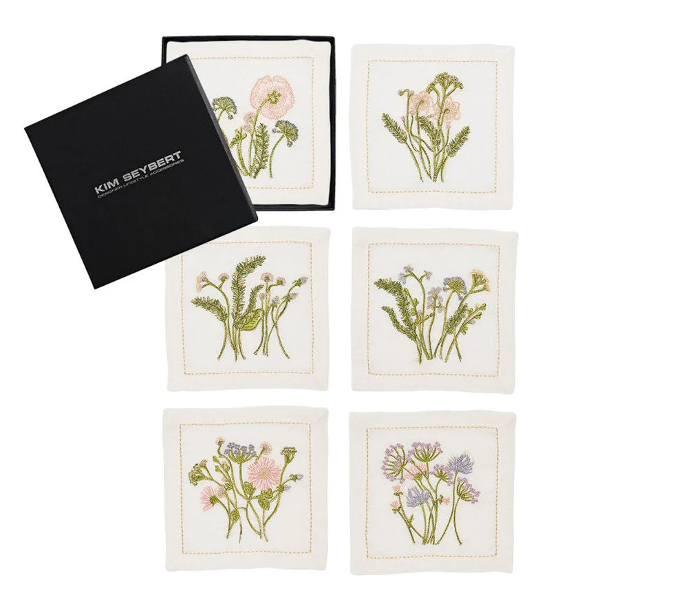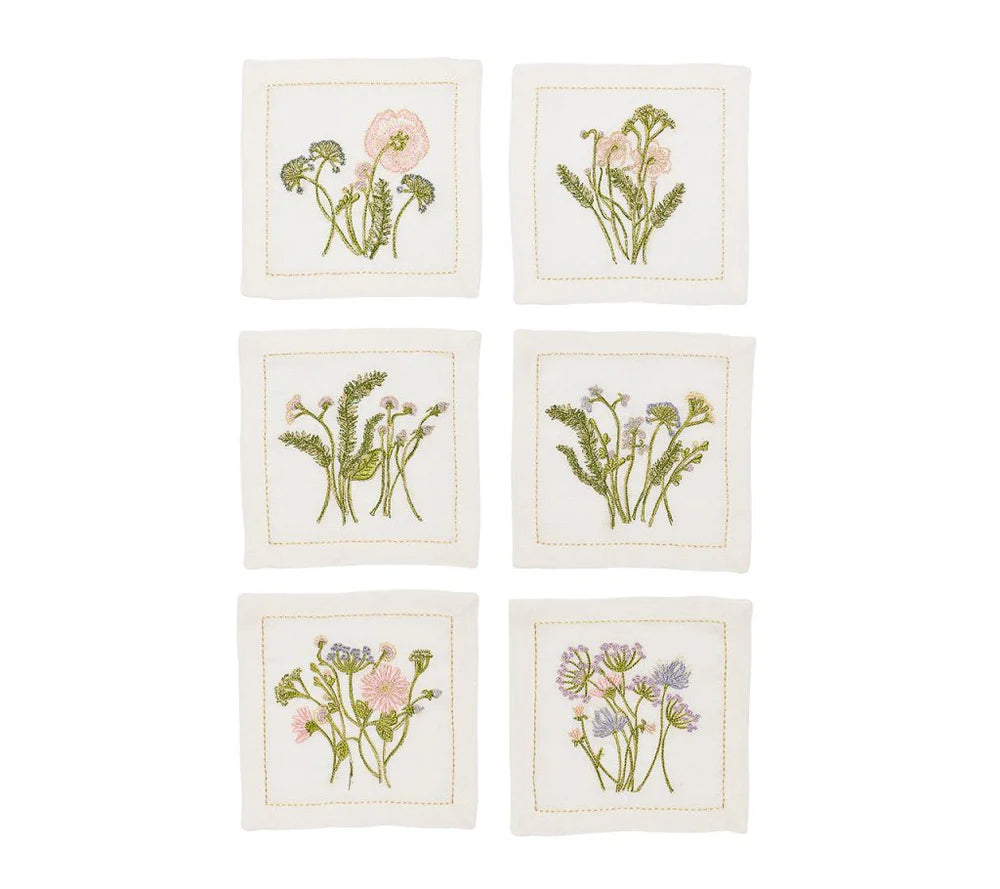 Each napkin showcases a distinct hand-sketched garden flower scene, which is then embroidered on to the linen napkin. The delicately embroidered blooms capture the essence of a wildflower bouquet in a sunlit meadow.