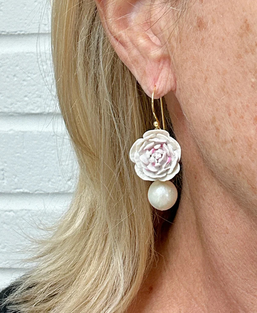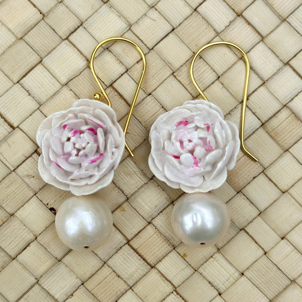 A beautiful handcrafted white peony perches above a large round freshwater pearl drop. 14k gold plate earwire.