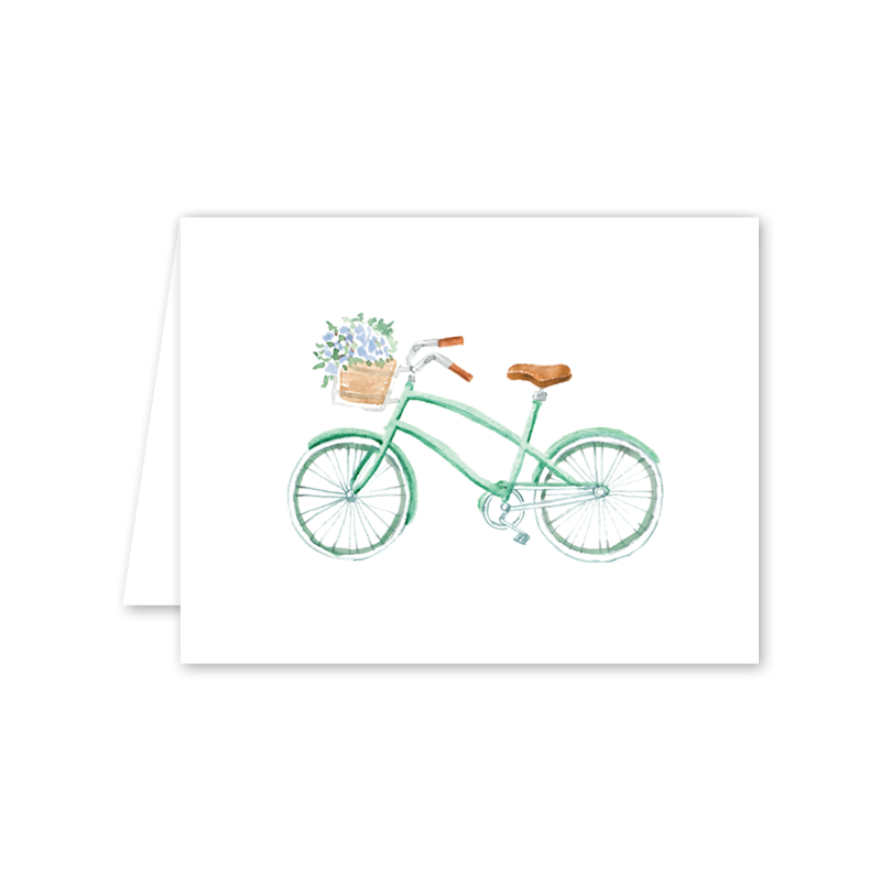 This all occasion fresh note card features a bicycle cruiser with flowers in its basket.