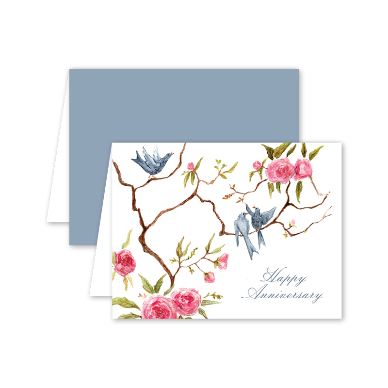 Celebrate your milestones with this elegant anniversary note card featuring birds, vining twigs and blooms.