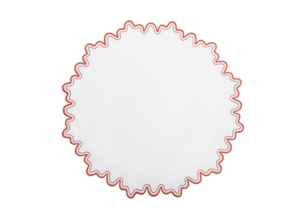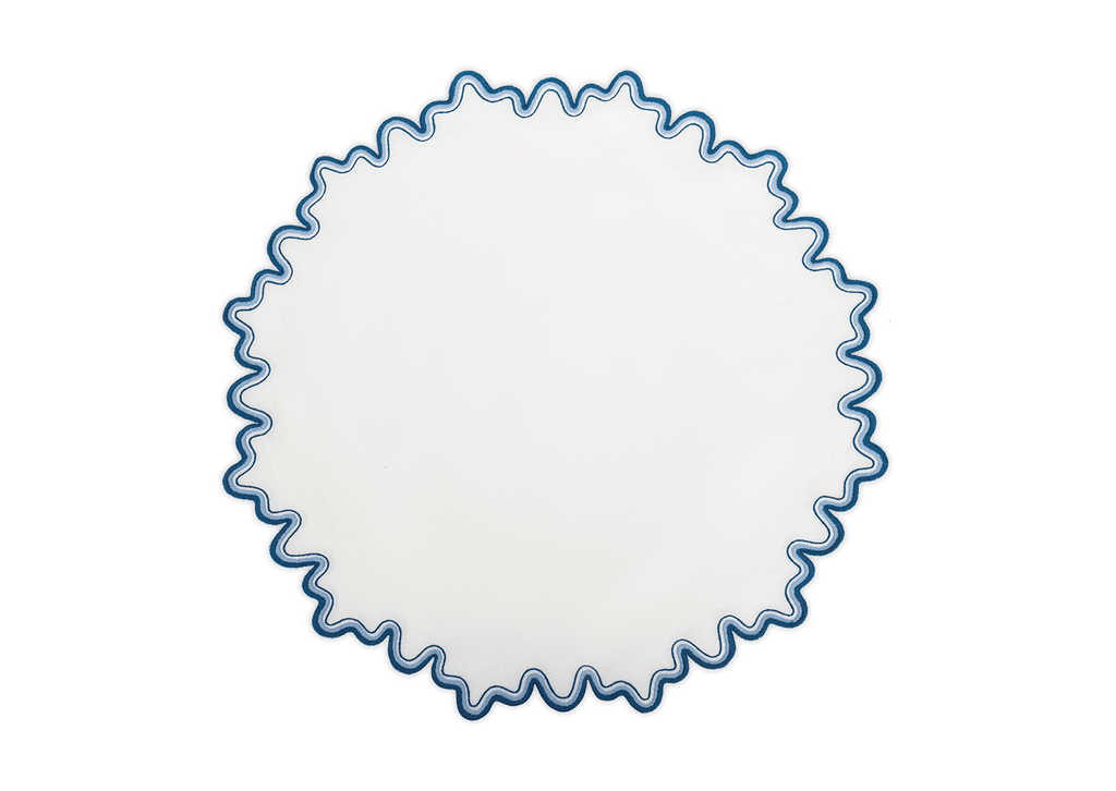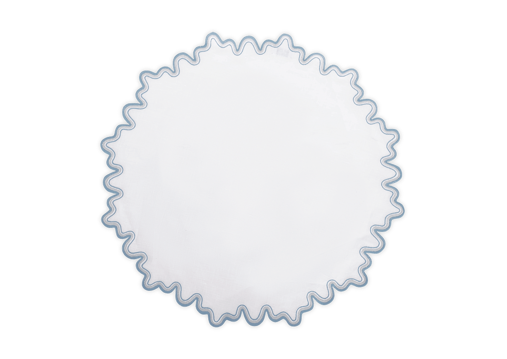 This meticulously embroidered tabletop style features a two-tone border on luxurious linen. It adds a whimsical feel to any dining space.